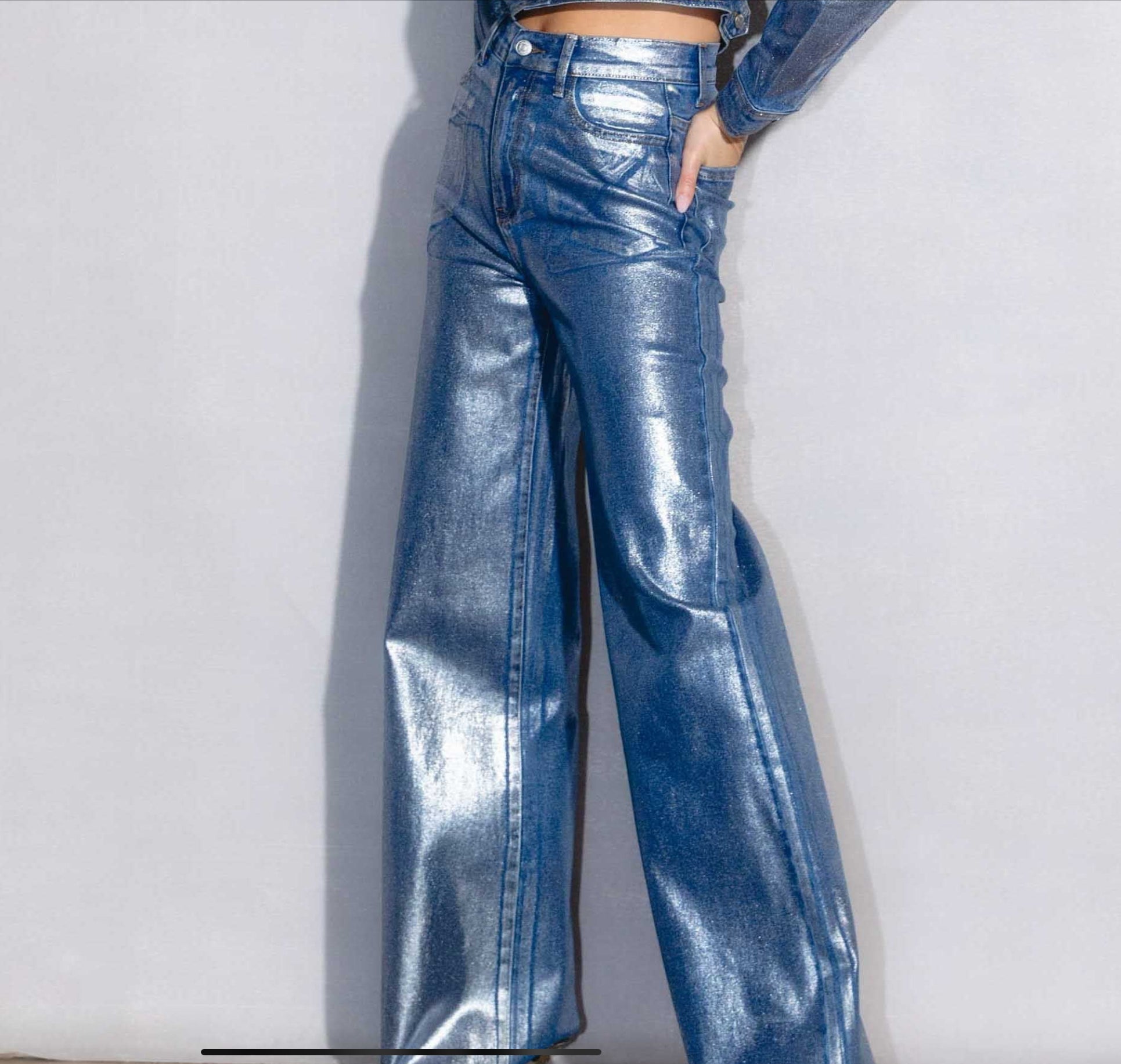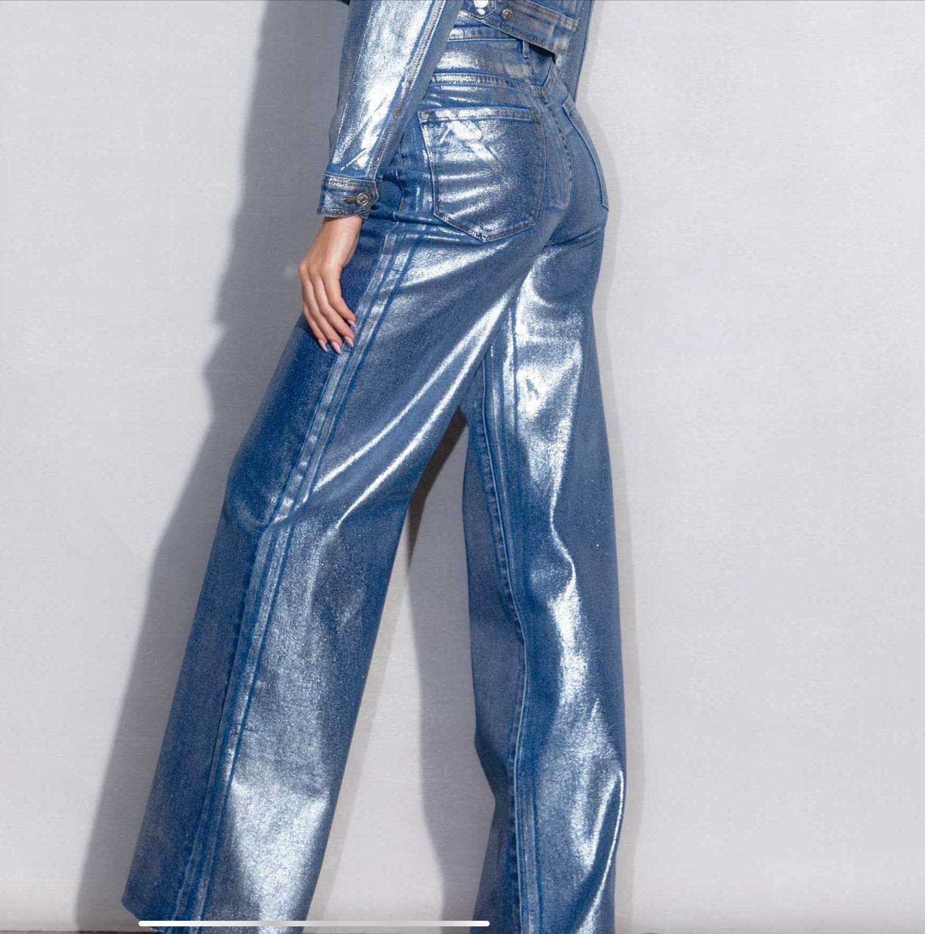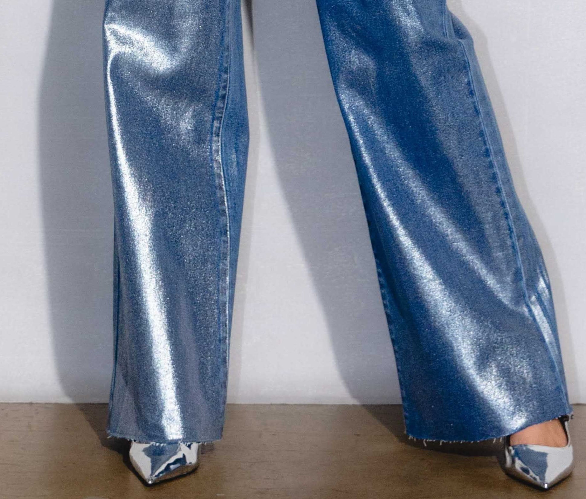 A pair of metallic wide leg jeans featuring raw edge hem leg opening, a 5-Pocket construction and a zip-fly closure.
